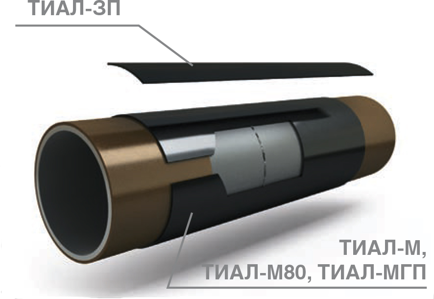 Манжета ТИАЛ-М имеет двухслойную конструкцию (полиэтиленовая основа и термоплавкий адгезив), а при применении с двухкомпонентным жидким эпоксидным праймером, образует трехслойную антикоррозионную защитную систему, аналогичную заводскому изоляционному покрытию трубопровода – изоляции весьма усиленного типа (ВУС изоляции).